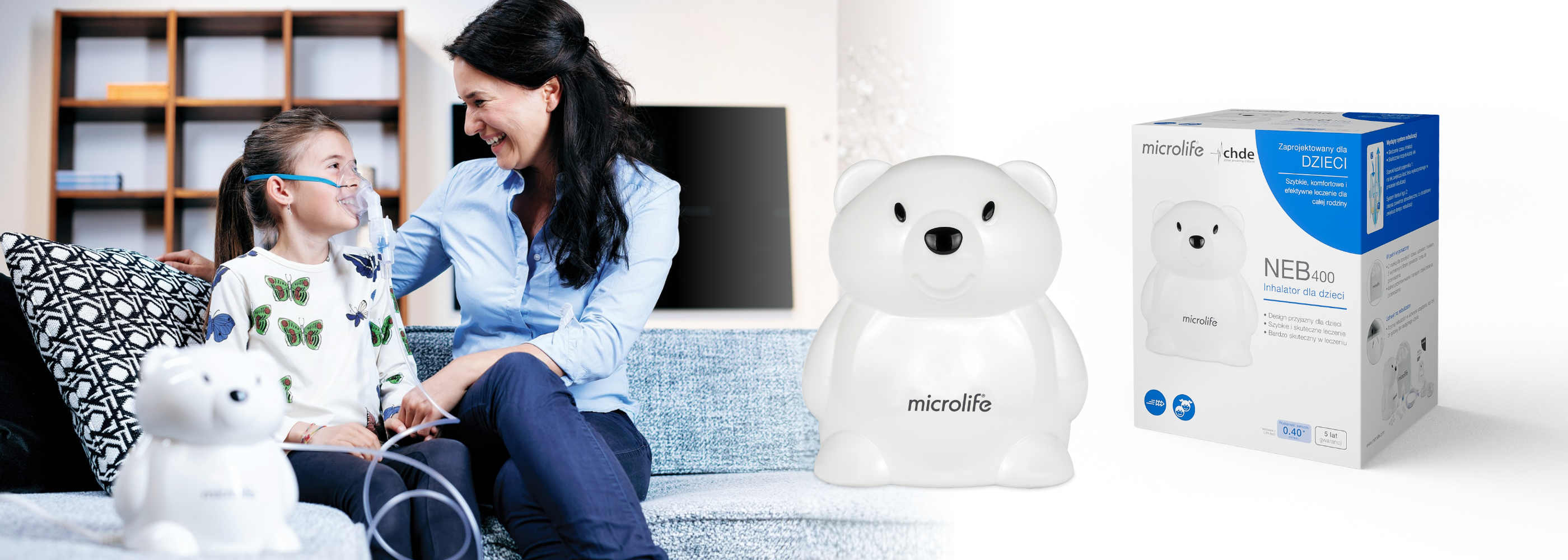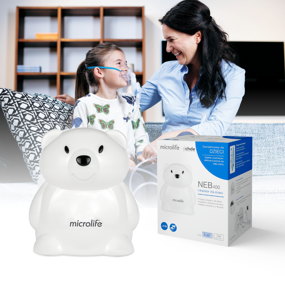 Microlife NEB 400 to wydajny inhalator kompresorowy, który łączy profesjonalną skuteczność nebulizacji z designem przyjaznym dzieciom. Obudowa w kształcie sympatycznego misia pomaga najmłodszym oswoić się z inhalacją, zmieniając codzienną terapię w spokojny i pozytywny rytuał.